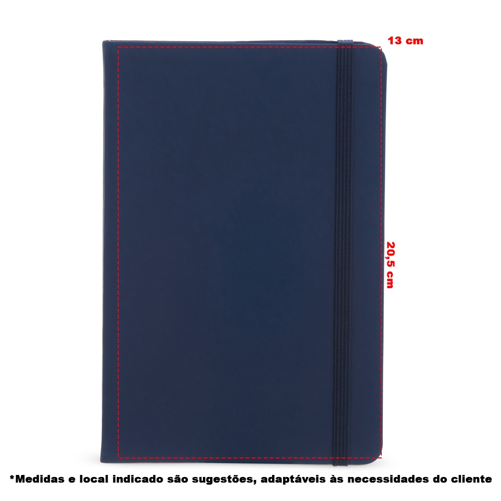 Caderneta em couro sintético emborrachado, possui marca página em cetim e elástico para lacre. Contém aproximadamente 80 folhas marfim pautadas.