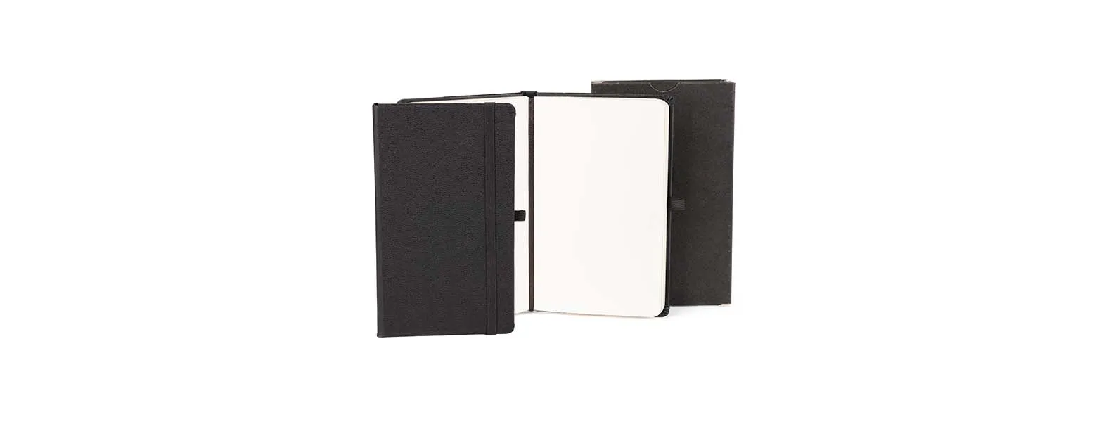 Caderno para anotações preto com capa dura.