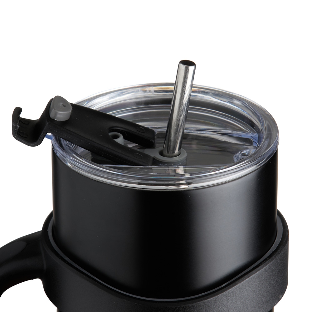 Caneca térmica de inox com capacidade para 800 ml, contém duas tampas, sendo uma acrílica com bocal, trava de segurança, e uma pequena tampa acoplada emborrachada para dissipação da temperatura, e a segunda tampa acrílica, contém compartimento que ao deslizar acessará ao bocal. Acompanha canudo de inox e escovinha de limpeza.
