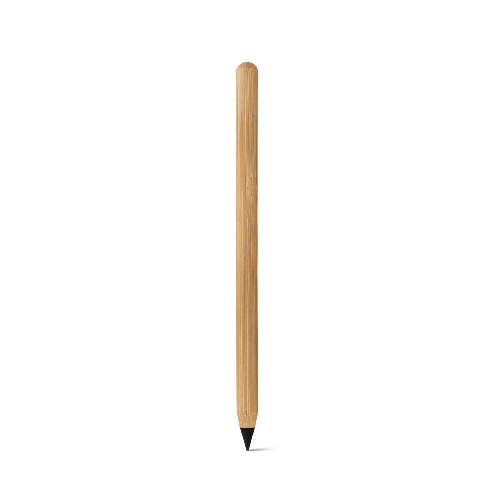 Caneta sem tinta em bambu com ponta de liga metálica com grafite, tampa protetora plástica. Apta para um uso prolongado sem a necessidade de apontar e a escrita pode ser apagada. Escrita mínima de 2km. A cor e o resultado da impressão nos materiais naturais pode variar entre produtos. Ø8 x 138 mm