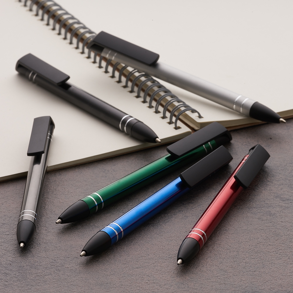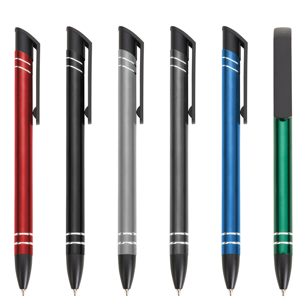 Caneta semimetálica com carga esferográfica azul e acionamento por clique.