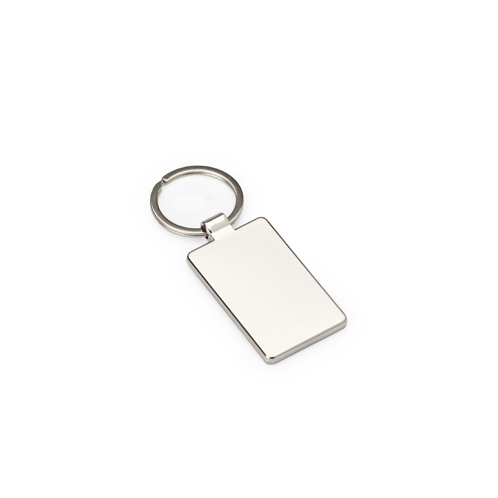 Chaveiro de metal retangular, frente com detalhe em bambu e verso liso.