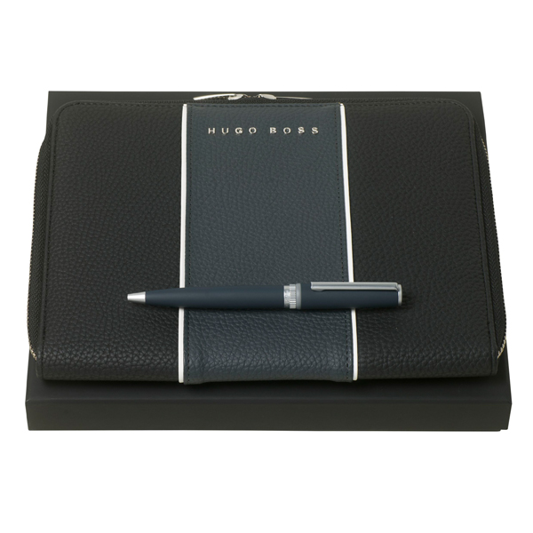 Kit pasta A5 e esferográfica. Blue. Coleção Gear. Pasta com zíper e caderno de 40 folhas. Embalagem "Hugo Boss" inclusa. Pasta: 185 x 242 x 25 mm | Esferográfica: ø13 x 139 mm