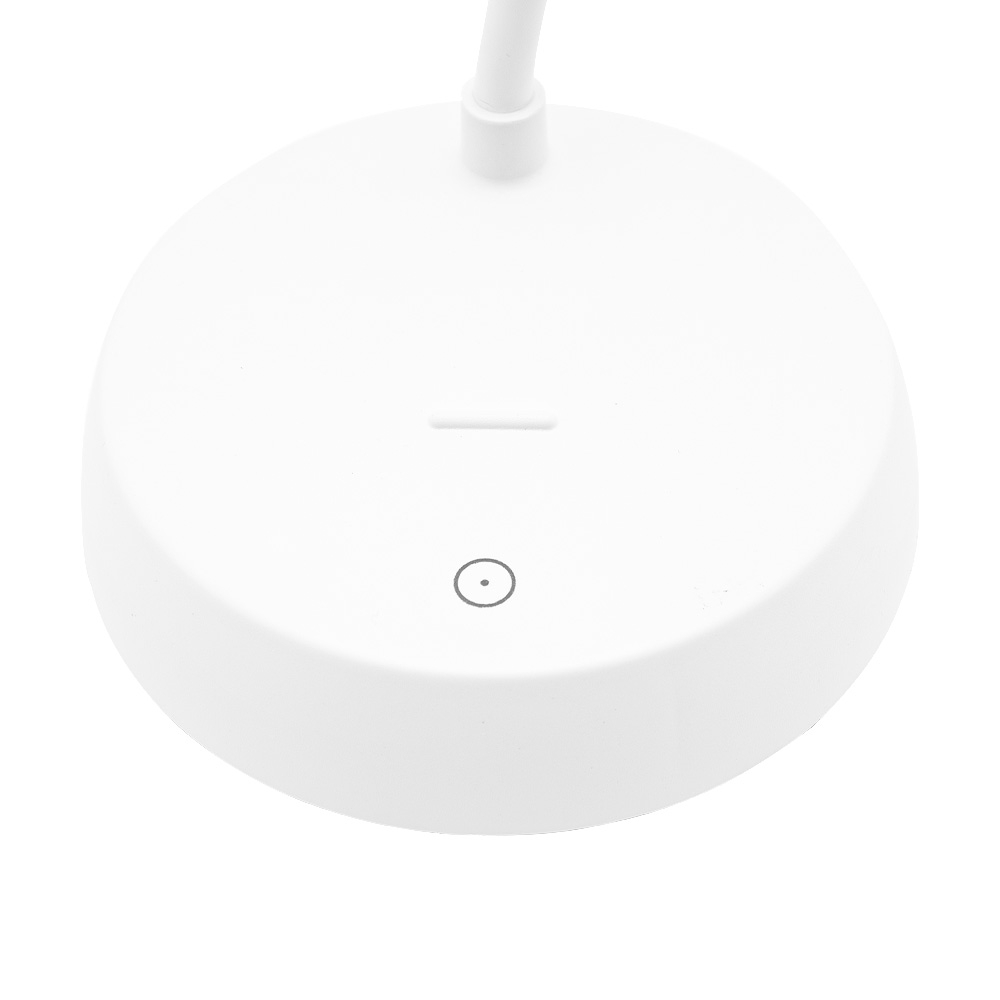 Luminária articulável recarregável com 10 leds e funcionamento touch, material plástico. Contém três estágios de iluminação com regulagem de intensidade touch: luz fria (branca), luz quente (amarela) e luz mista (branca e amarela). Base com botão para ligar e desligar. Acompanha uma bateria de lítio e cabo USB para carregamento.