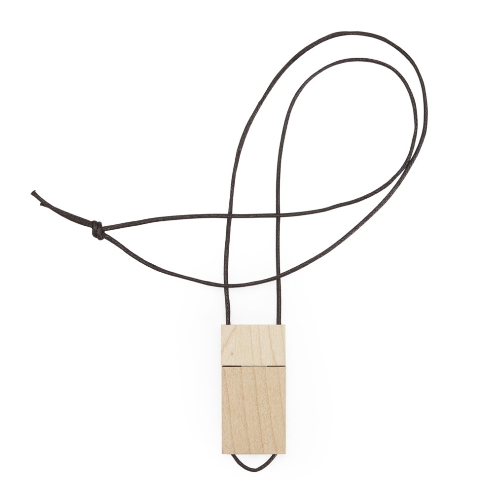Pen drive de madeira no formato retangular suspenso a um cordão.