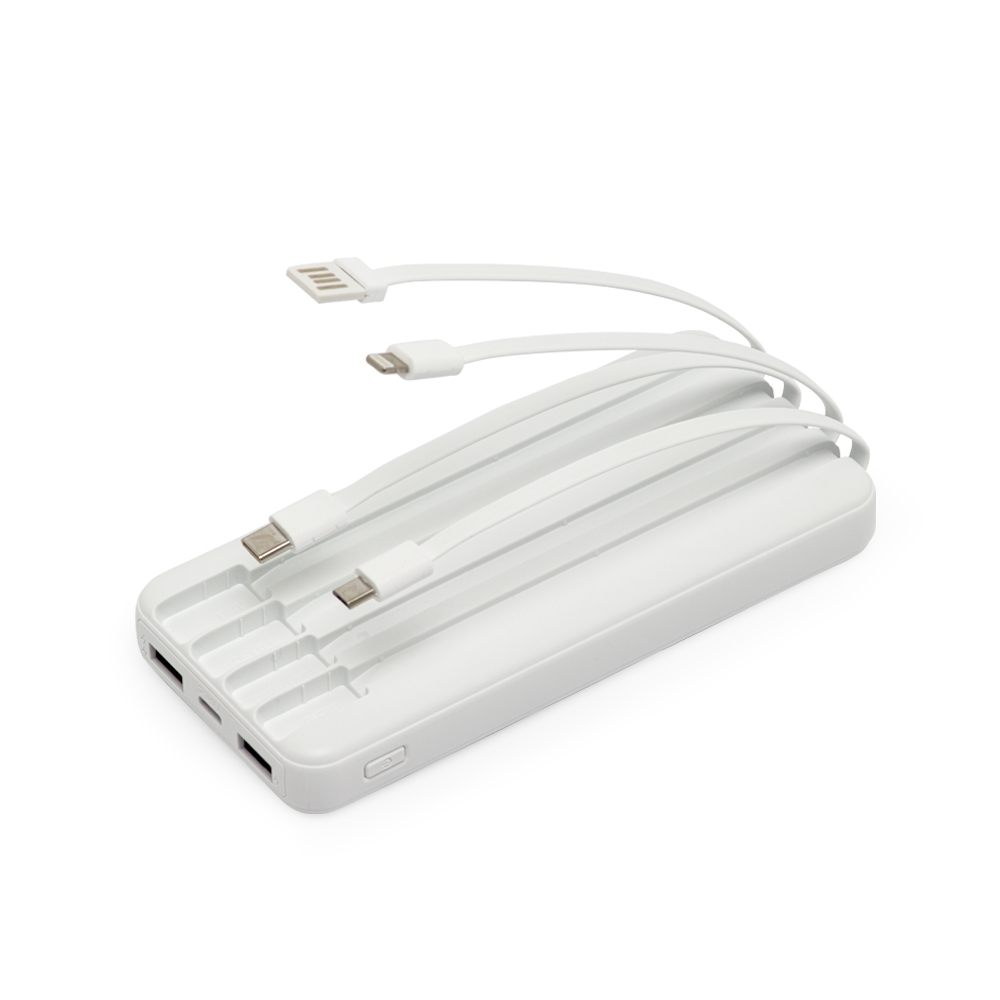 Carregador power bank de 10.000mAh com lanternas, múltiplas saídas. Fabricado em plástico com display integrado, este power bank vem equipado com quatro cabos de carregamento, eliminando a necessidade de transportar cabos extras. Compatível com entradas V8, Tipo-C, Lightning e USB, praticidade é o sinônimo deste carregador. Compacto, possui capacidade real de 6.000mAh para manter os dispositivos sempre carregados. Acompanha cabo USB-V8.